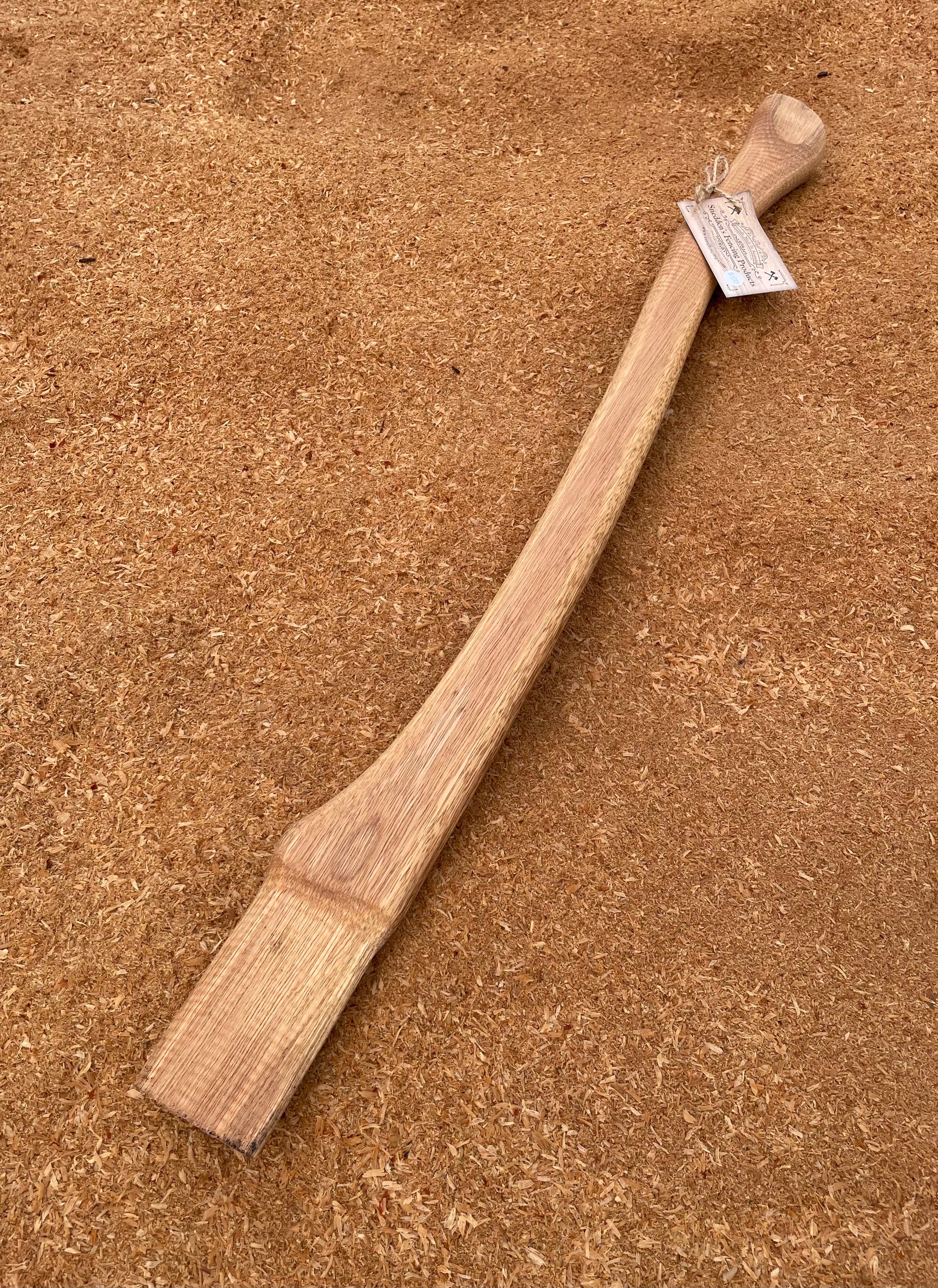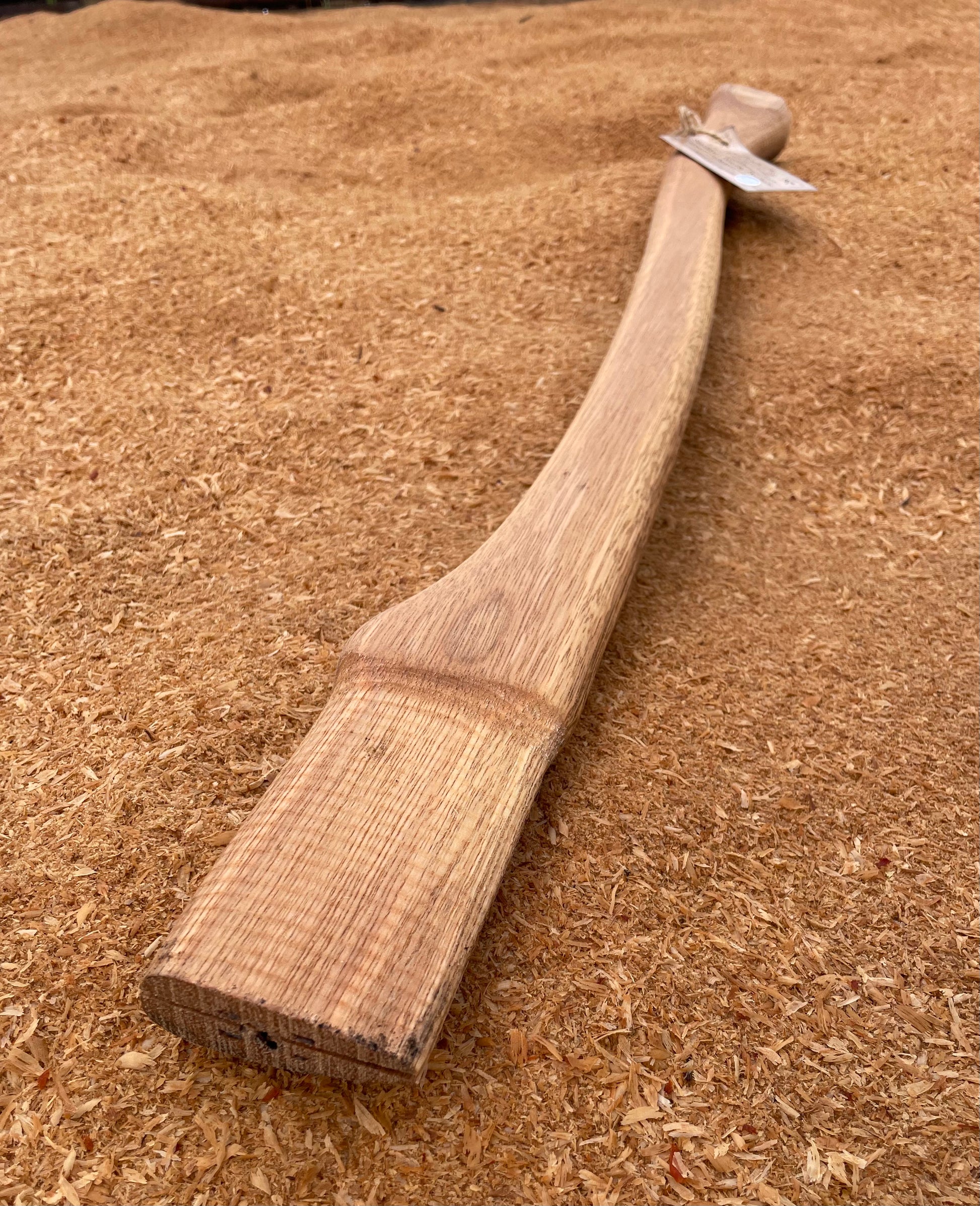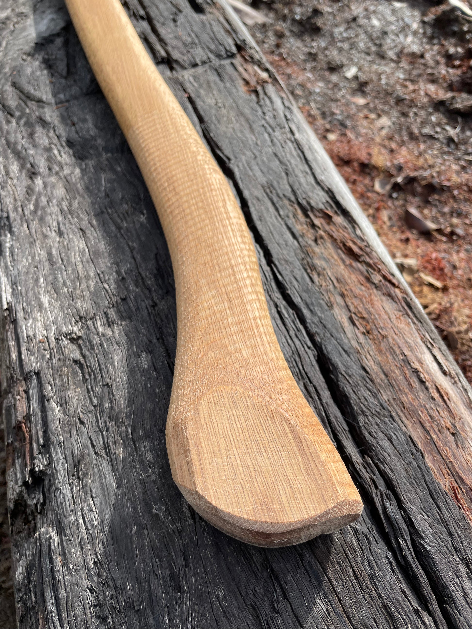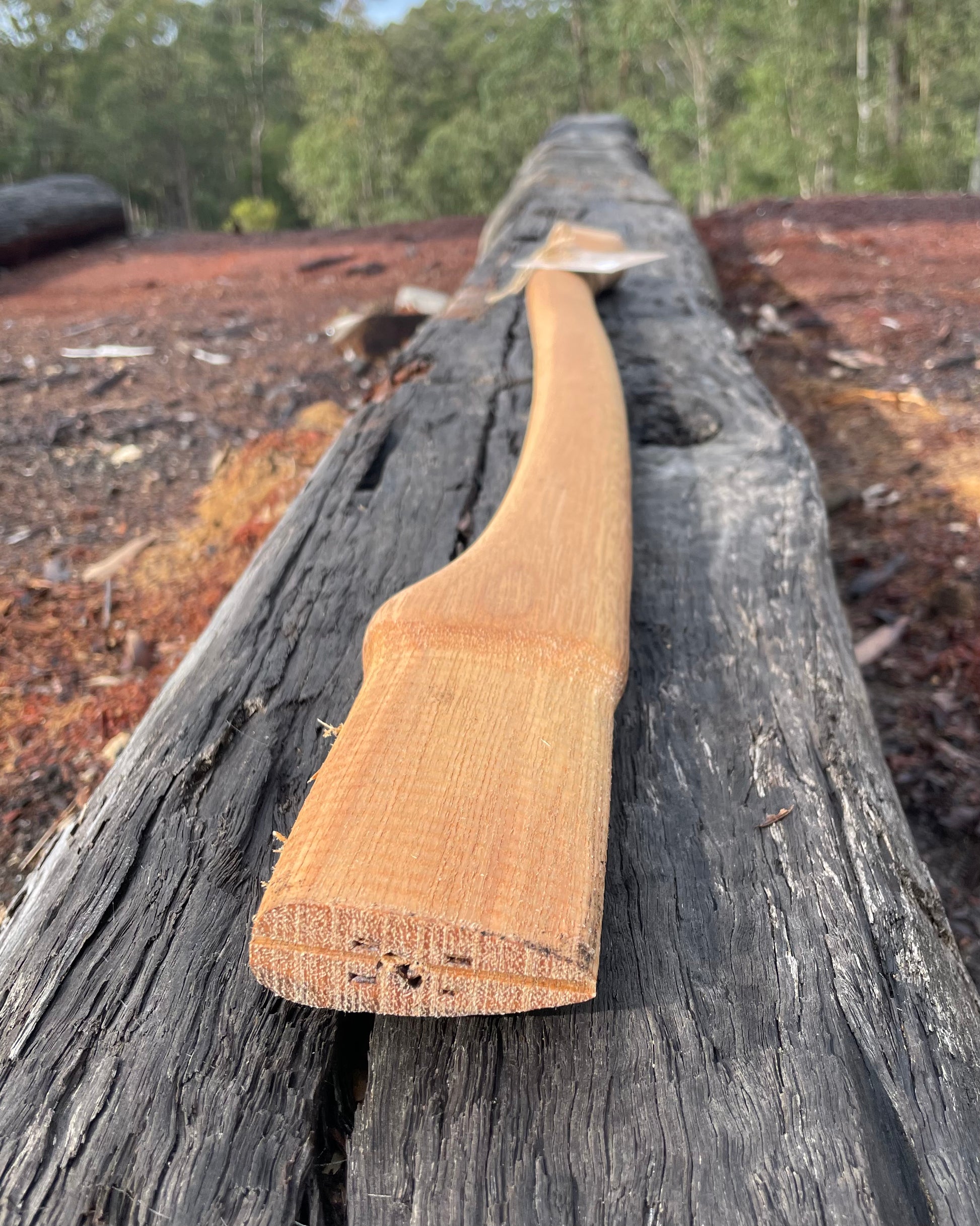 Snedden's ergonomic design axe handle 800mm . Made in house from local spotted gum . Oiled finish. Textured grip area. Eye dimensions 60mm x 23mm at widest point approx.