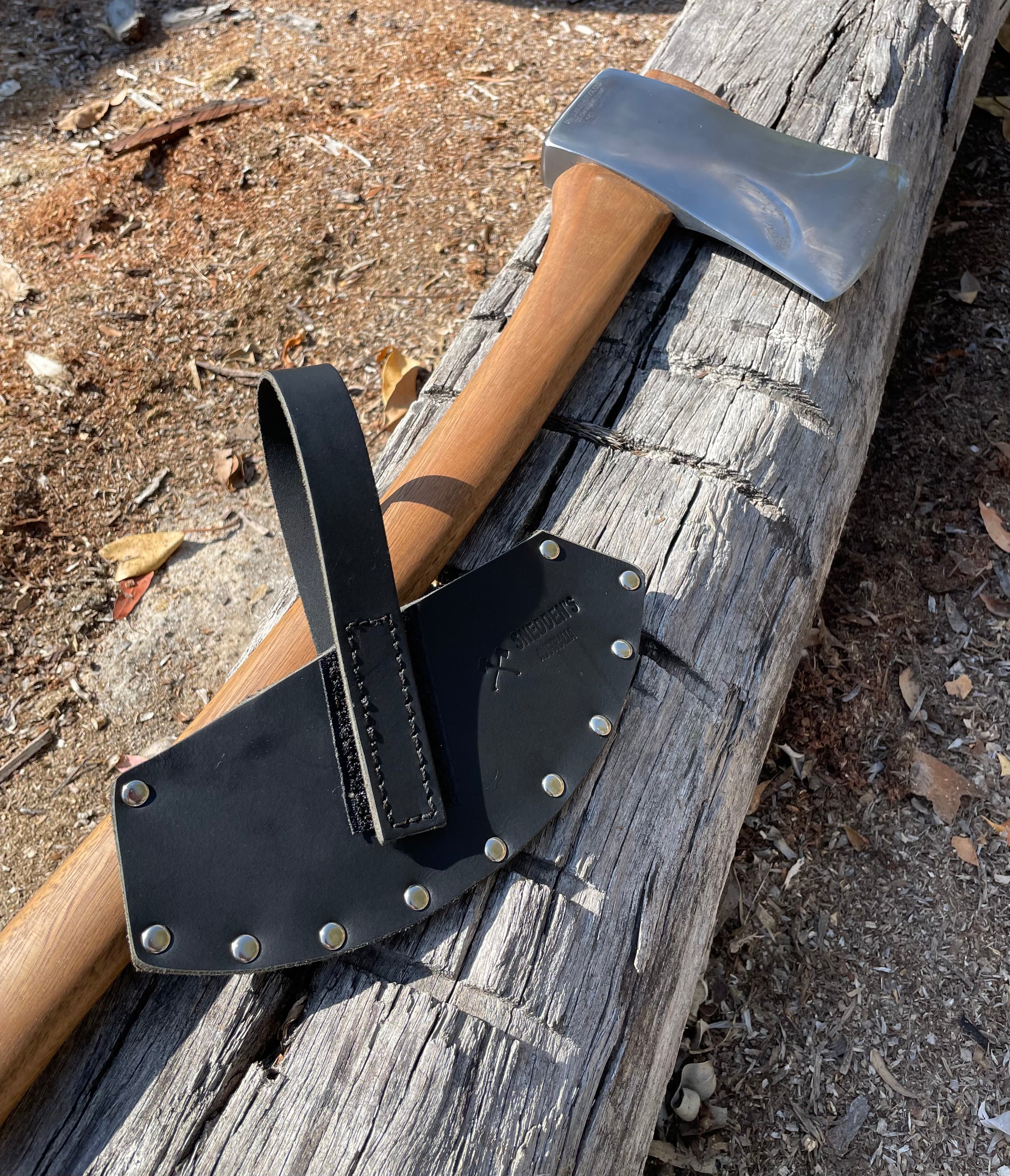 Reconditioned Kelly St Catharines axe on a Snedden 800mm spotted gum Snedden handle with smooth oiled finish and textured grip. Spotted gum wedge. Includes Snedden leather sheath in black 4mm leather. Made In Canada.
